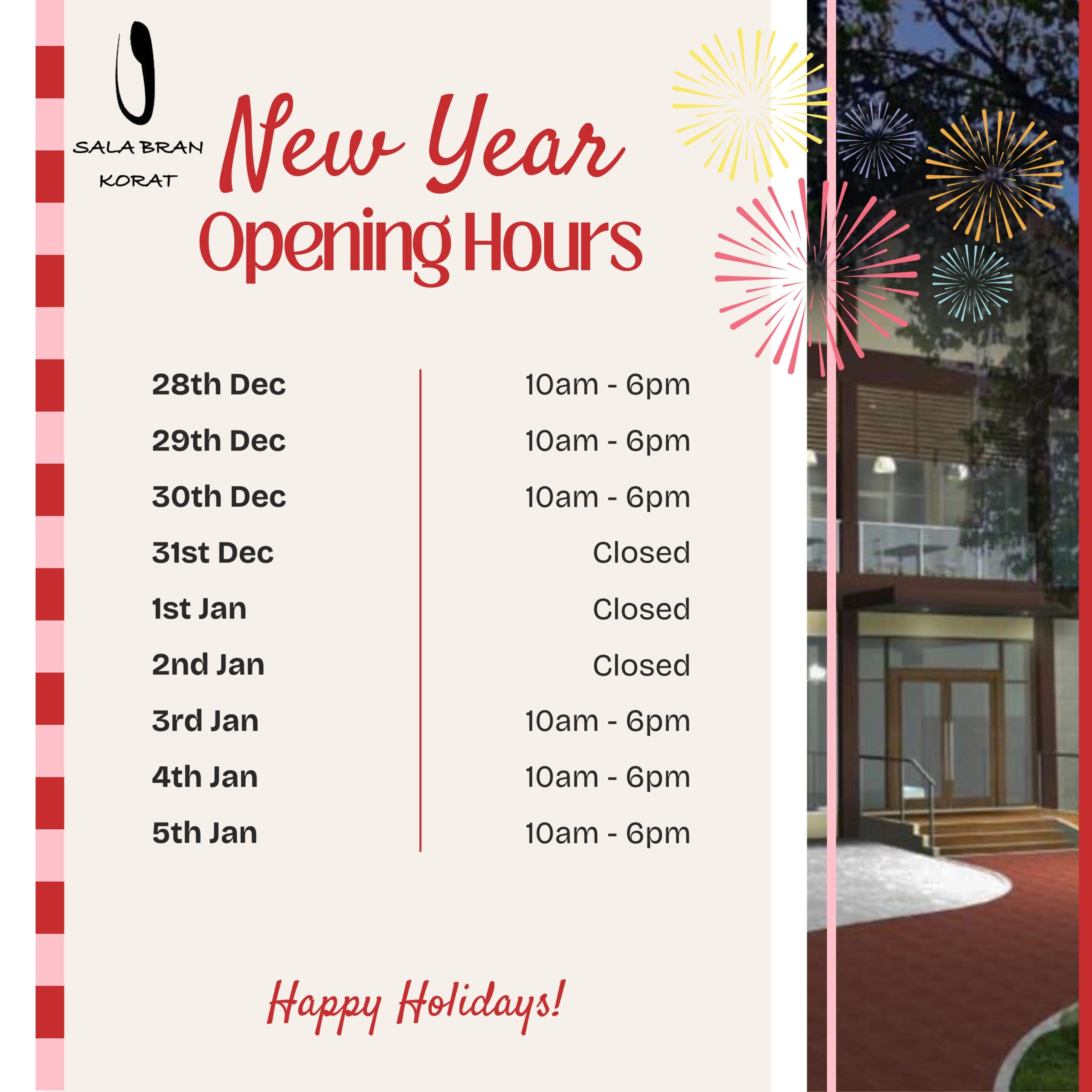 ศาลารำข้าวโคราช ขออนุญาตแจ้งวันเวลา เปิด – ปิด ช่วงเทศกาลปีใหม่ ดังนี้